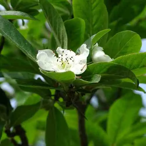 - Цветки белого и розовато-белого цвета, схожи с айвовыми;
